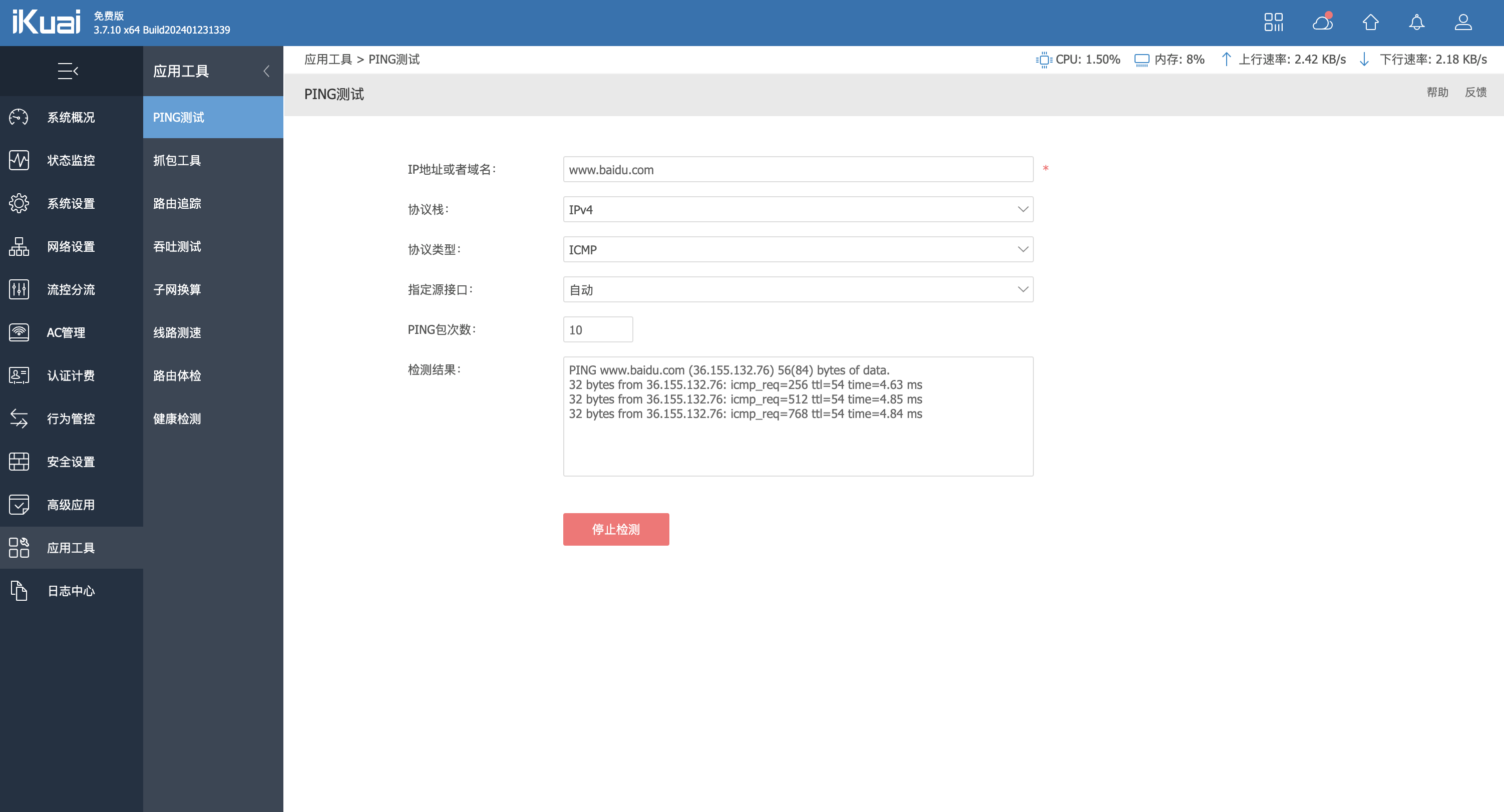 应用工具->PING 测试