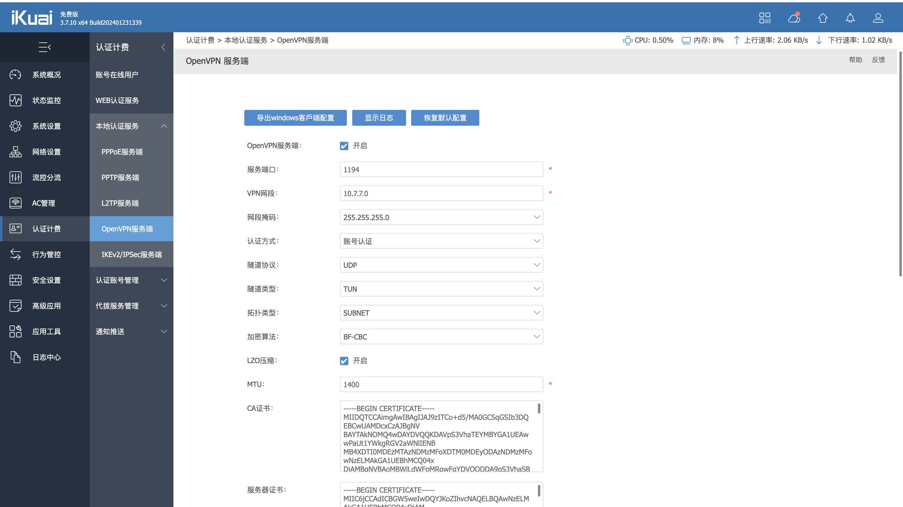 认证计费 -> 本地认证服务 -> OpenVPN 服务端