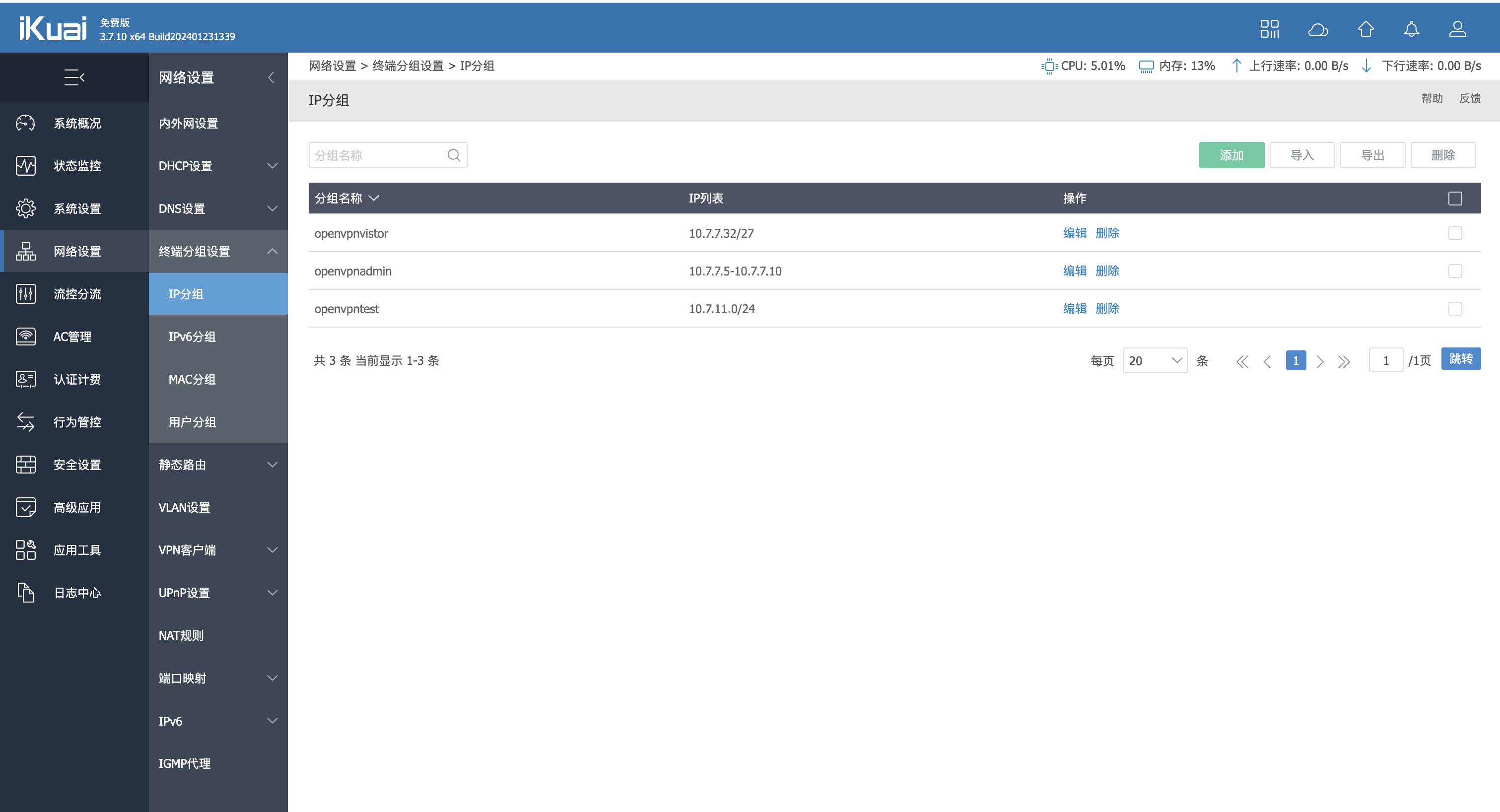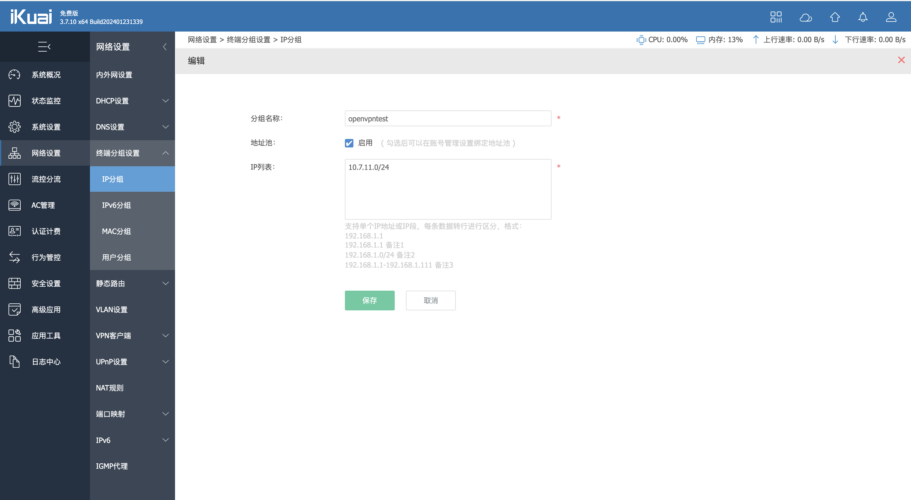 配置分组进入 IP 分组页面,此页面也可以通过 网络设置->终端分组设置->IP分组。