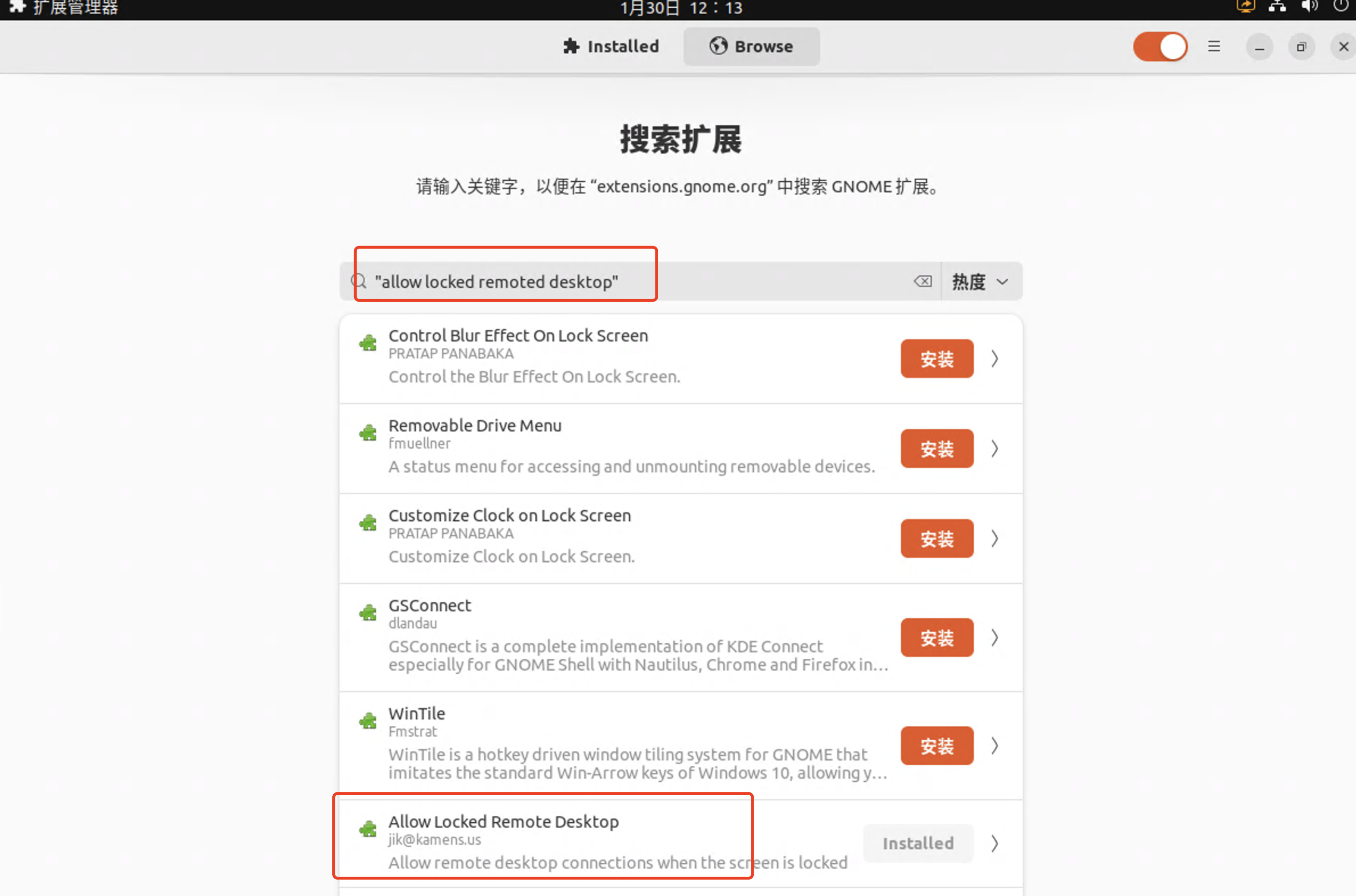 打开之后,在 browser 页里搜索 allow locked remoted desktop,点击进行安装即可。注意,这里如果配置了代理,可能出现闪退的情况。